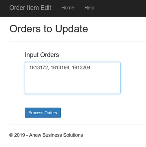The home page, shown below, allows you to provide one or more orders to update. The first valid