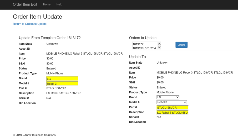Specify one or more orders for updating. For example, if you have several orders that need to ship an LG Rebel 3